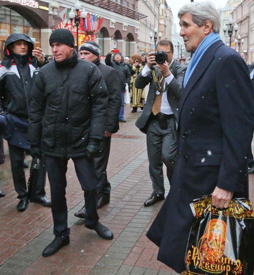 Návštěva se uskutečnila na žádost americké strany. Víte asi, že v diplomatické řeči to znamená, že hostitelská strana má v něčem ( v politických věcech) převahu, a druhá strana má zájem věci urovnat. Kerry se měl setkat s Lavrovem a potom měl přislíbenou schůzku s Putinem. Putin, vzhledem ke své zaneprázdněnosti, si na Kerryho udělal čas až 6 hodin po ukončení schůzky s Lavrovem. Hodiny čekání Kerry využil na procházku po Moskvě. Na Arbatu utrácel peníze za ruské suvenýry – foto: