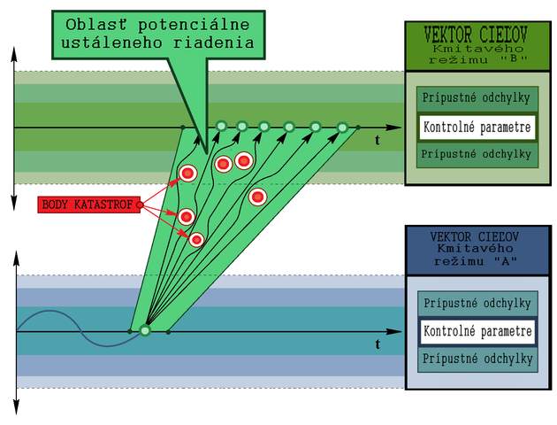 „Neplynulá“ trajektória môže byť projekciou úplne „plynulej“ trajektórie, ležiacej v priestore parametrov väčšej rozmernosti (vyššej dimenzie)* do podpriestoru menšej rozmernosti (nižšej dimenzie)*. Oblasť potenciálne udržateľného riadenia v zmysle predpovedateľnosti riadenia v priestore parametrov vektora stavu vo vzťahu ku konkrétnemu uzavretému systému je objektívna dannosť (realita). V ňom je množstvo objektívne možných trajektórií manévrov; aj množstvo objektívne nemožných. V množine objektívne možných trajektórií je možné vyčleniť podmnožinu trajektórií, na ktorých ležia body „katastrof“. Môžu to byť body porušenia druhej derivácie vektora stavu podľa času; body prekročenia zavedených ohraničení vektora-derivácií; body zmeny miery predvídateľnosti (napr. body vetvenia trajektórií v pravdepodobnostnom zmysle); body na hraniciach medzi dvoma potenciálovými jamami a pod.