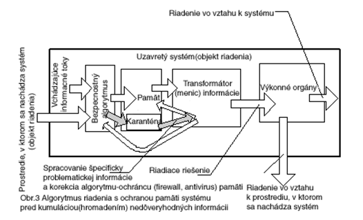V ňom všetko prebieha, ako v druhom type, ale pred uložením do pamäte prechádza vstupný tok informácie cez bezpečnostný algoritmus. Ten rozpoznáva nedôveryhodnú a podozrivú informáciu, vrátane pokusu o priame a nepriame (sprostredkované) riadenie zvonku. Prechod cez bezpečnostný algoritmus je kvôli tomu, aby sa vypracovanie riadiaceho riešenia zakladalo iba na informácii, vyhodnotenej ako spoľahlivá. V tých prípadoch, keď vznikajú ťažkosti s určením kvality informácie, algoritmus - strážca pamäte – ju umiestni do špecializovanej oblasti pamäte, znázornenej na obrázku 3 obdĺžnikom s názvom „Karanténa“, pre následné vyjasnenie dôveryhodnosti. Algoritmus, znázornený na obr. 3, predpokladá, že obdĺžnik s názvom „Transformátor (menič) informácie“ má v systéme najvyššie právomoci. Preto môže premiestňovať informacie z „Karantény“ do oblasti normálnej „Pamäte“ a meniť „Bezpečnostný algoritmus“ podľa miery nahromadenia skúsenosti systému s prostredím. To vyžaduje v procese riadenia prehodnotenie obsahu pamäte podľa kategórií „dôveryhodné“, „lživé“, „podozrivé“, „neurčené“.