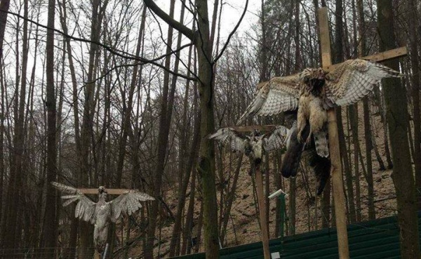 Níže je obraz ukřižovaného ptáka. To v Mežigore militanté přibili na kříže BERKUTY (poddruh orla). Sakrální oběť. Mimochodem „aktivisté“ ukřižovali tři orly-berkuty zcela bez ohledu na to, že se jedná o druh zapsaný v červené knize.